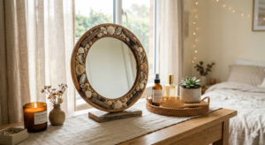 • Gương decor viền gỗ/vỏ ốc: Một chiếc gương trang trí nhỏ nhắn đặt trên bàn trang điểm không chỉ là vật dụng hữu ích mà còn là món đồ decor cực “chill”. Xem thêm các mẫu gương decor handmade độc đáo tại đây)